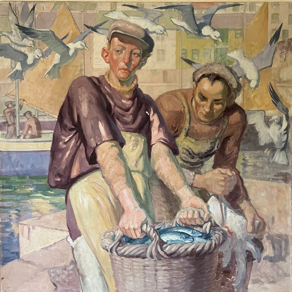 Unknown fishermen from a painting in the mid-20th century. What do you see in these faces or the setting around them? Do you know anyone who does this work or have you had your own experiences of sea fishing that you could describe?
