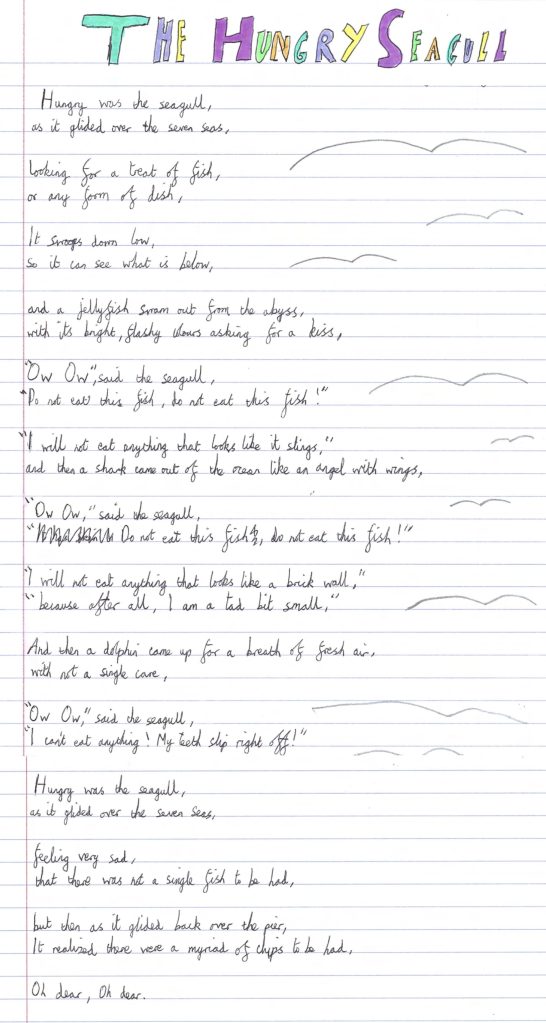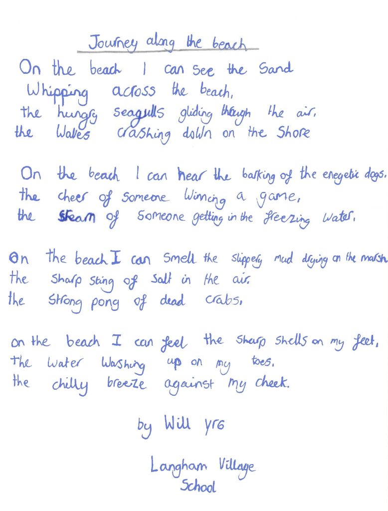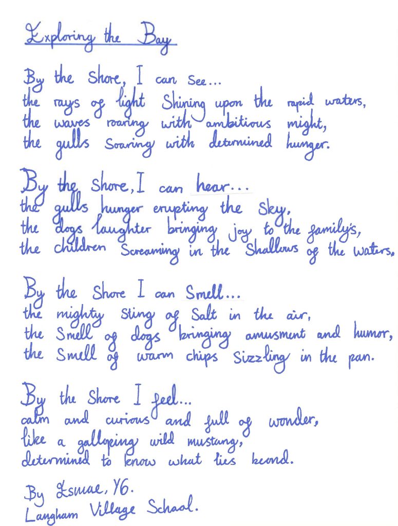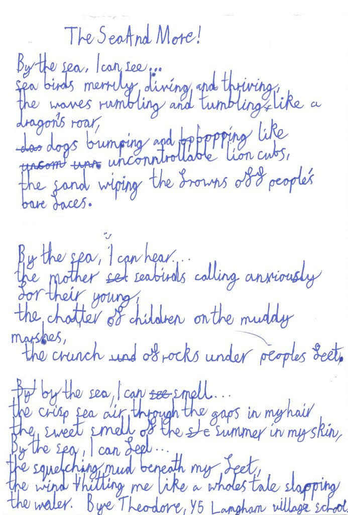 “The poems by Esmae, Will, and Theodore of Langham Village School stood out for their fresh perceptions and more interesting vocabulary: it was hard to decide between them, but I went in the end for Theodore’s “The Sea And More!”, for its rolling rhythms and inventive sound-effects, and its surprising last line.” – Alan Hollinghurst