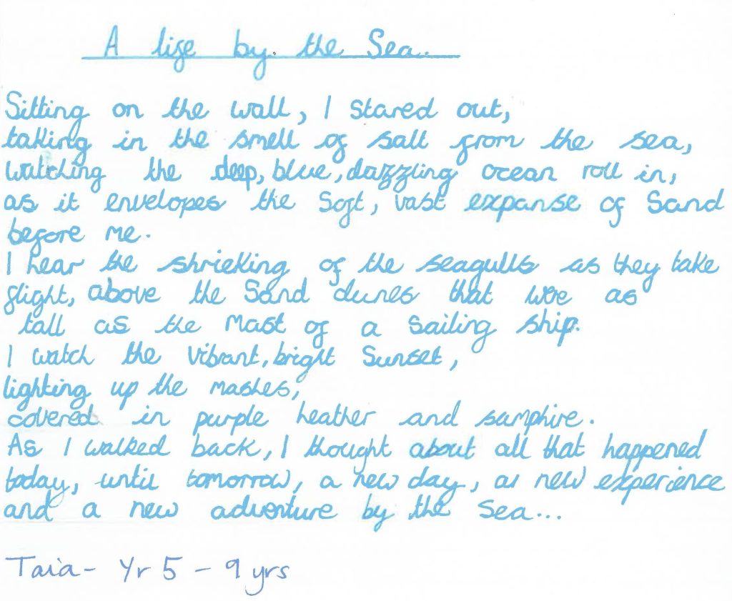 North Norfolk is defined by the sea. Local school children were invited to write about it from a full range of perspectives – animal, human or that of an object, including the sea itself – and to bring their writing to life with sensory details. Some schools set aside time to take the children out into the landscape where they were encouraged to see, hear, feel and imagine.